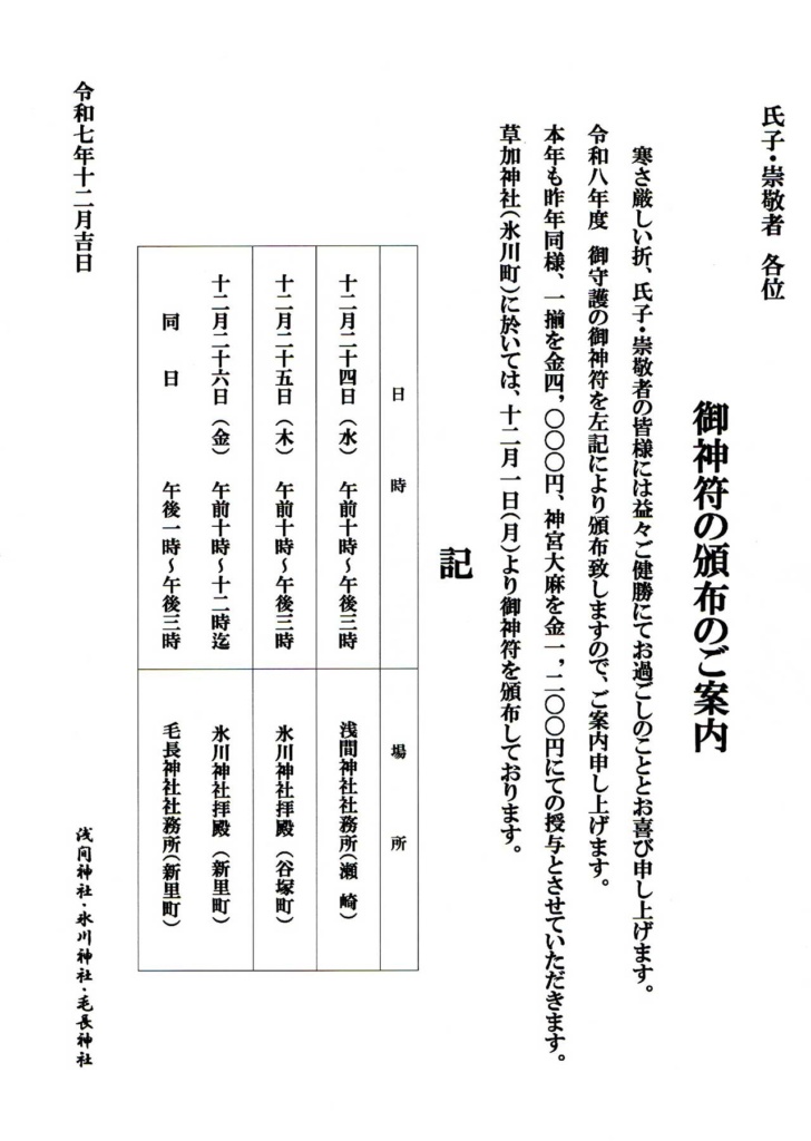 投稿日: 2025年12月4日2025年12月5日 投稿者: 管理者御神符の頒布(御札販売)のご案内 12月24日(水)午前10時~午後3時まで御神符の頒布(御札販売)を行います。 淺間神社社務所にて授与させて頂きます。 昨年のお札をお持ちの場合は、お預かり致します。